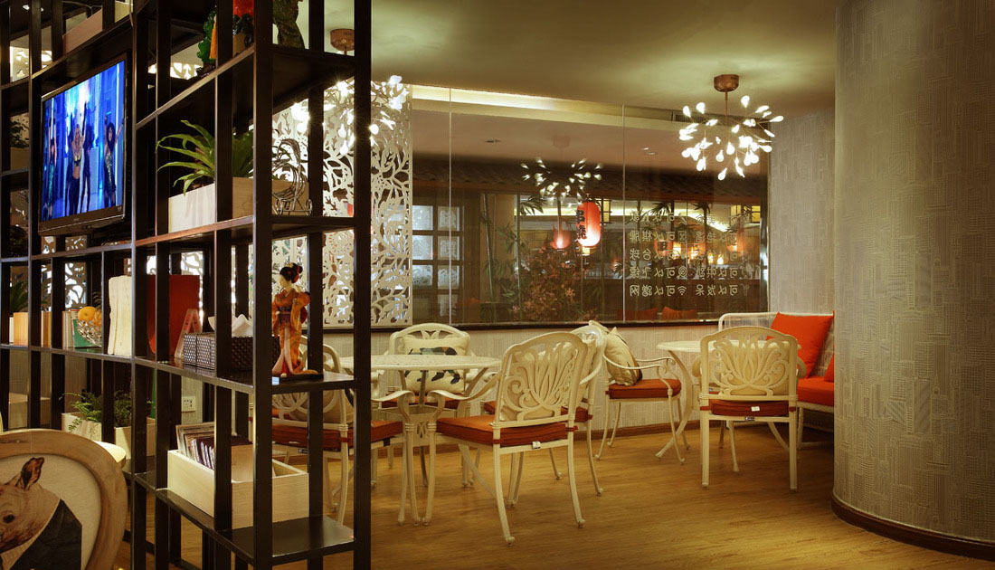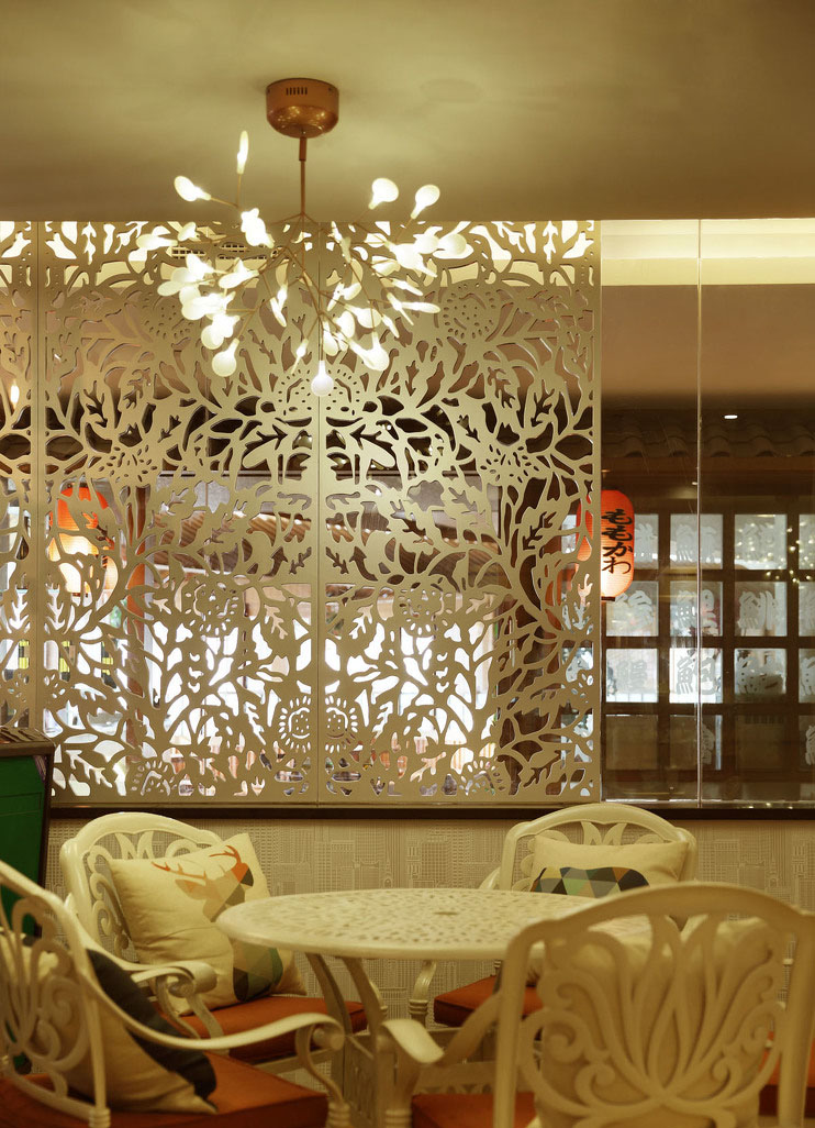 我們將原來的室內裝修拆除,大廳中間的混凝土圓柱是較難處理的。直徑約1.6米的圓柱占住了大廳相當一部分空間。設計師動了一番心思,圍繞圓柱布置沙發卡座,用木紋的鋁合金方通將圓柱裝飾起來,并延伸到天花上,四處發散,如同一棵參天大樹,根深葉茂,天花上再裝飾一些玻璃圓球燈,圓球立面有綠色植物裝飾,使得整個空間一下子活躍起來,原來作為障礙的圓柱變成了整個空間最濃筆重抹的部分。家具是設計師幫助挑選和購買的,力求和空間水**融,每個靠背和抱枕都有不同的圖案花紋,彰顯出細節的追求。